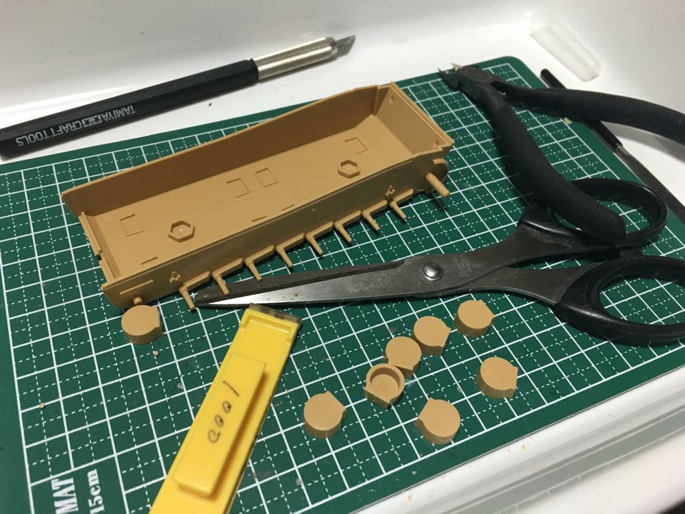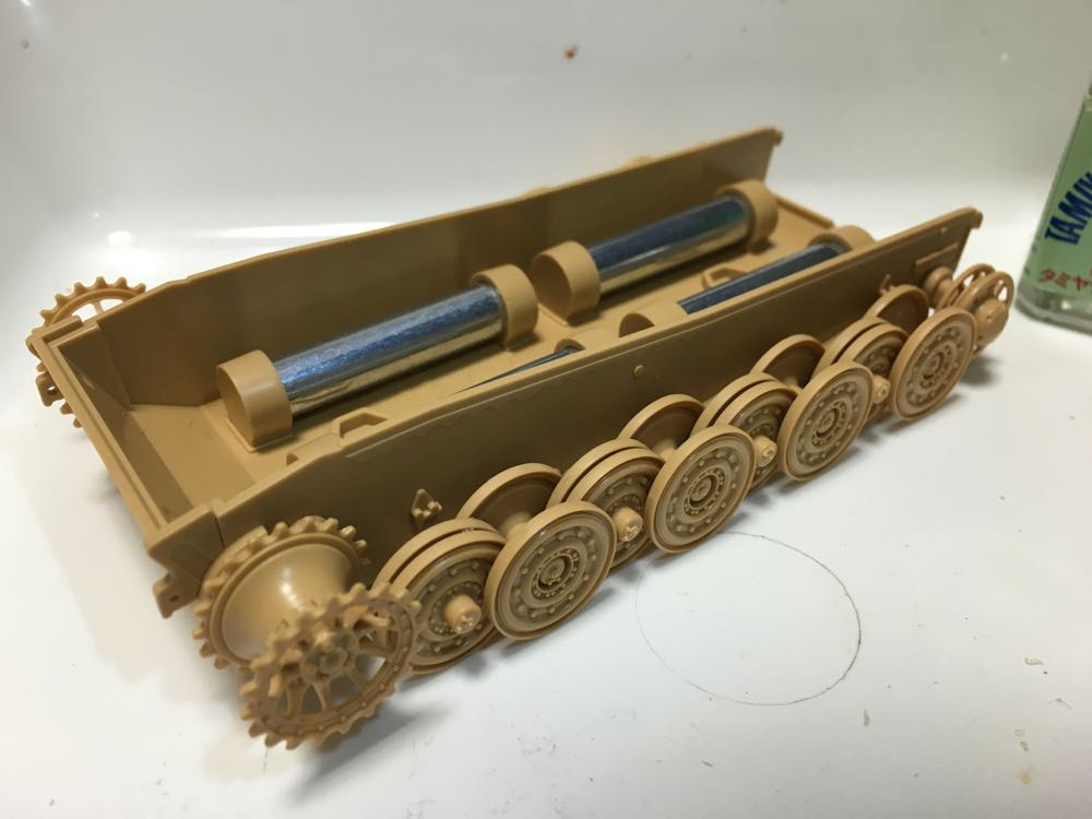 転輪づくりができたら、次はそれをシャーシーにとりつけます。